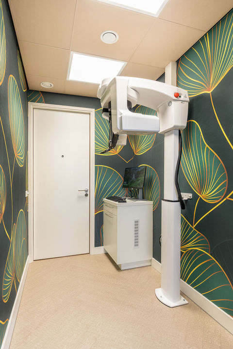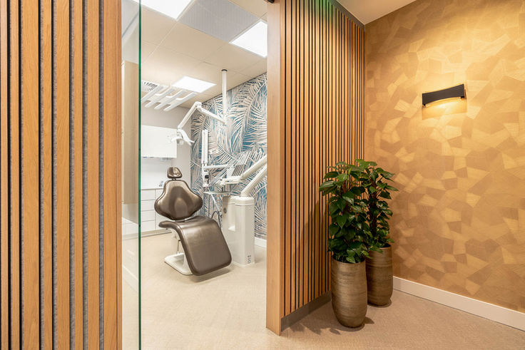 De wachtkamer voelt direct warm aan met de groene muur, de ronde houten receptie en de bijzondere, zelfgemaakte bank. Elke praktijkkamer heeft zijn eigen sfeervolle behang en de ‘gouden gang’ naar de kamers geeft een luxe uitstraling. “Een van onze medewerkers gaf aan dat ze het gevoel had dat ze een nieuwe baan had en dat vind ik eigenlijk het grootste compliment”, aldus een trotse Marc.